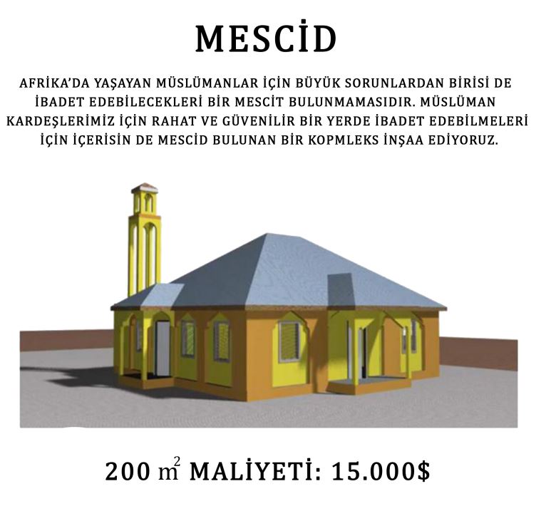 Afrika’da Mescit İnşa Ediyoruz. Afrika’da yaşayan Müslüman kardeşlerimizin hem bölgede azınlık olarak yaşamaları hem de çektikleri yoksulluk sorunları onları sınırlı sayıda mescide sahip olmasına neden olmaktadır. Bunun için Müslüman kardeşlerimizin en azından ibadetlerini daha konforlu ve rahat bir şekilde yapabilmeleri için temiz ve güvenli mescitlerin inşa edilmesine aracılık yapmaktayız.
